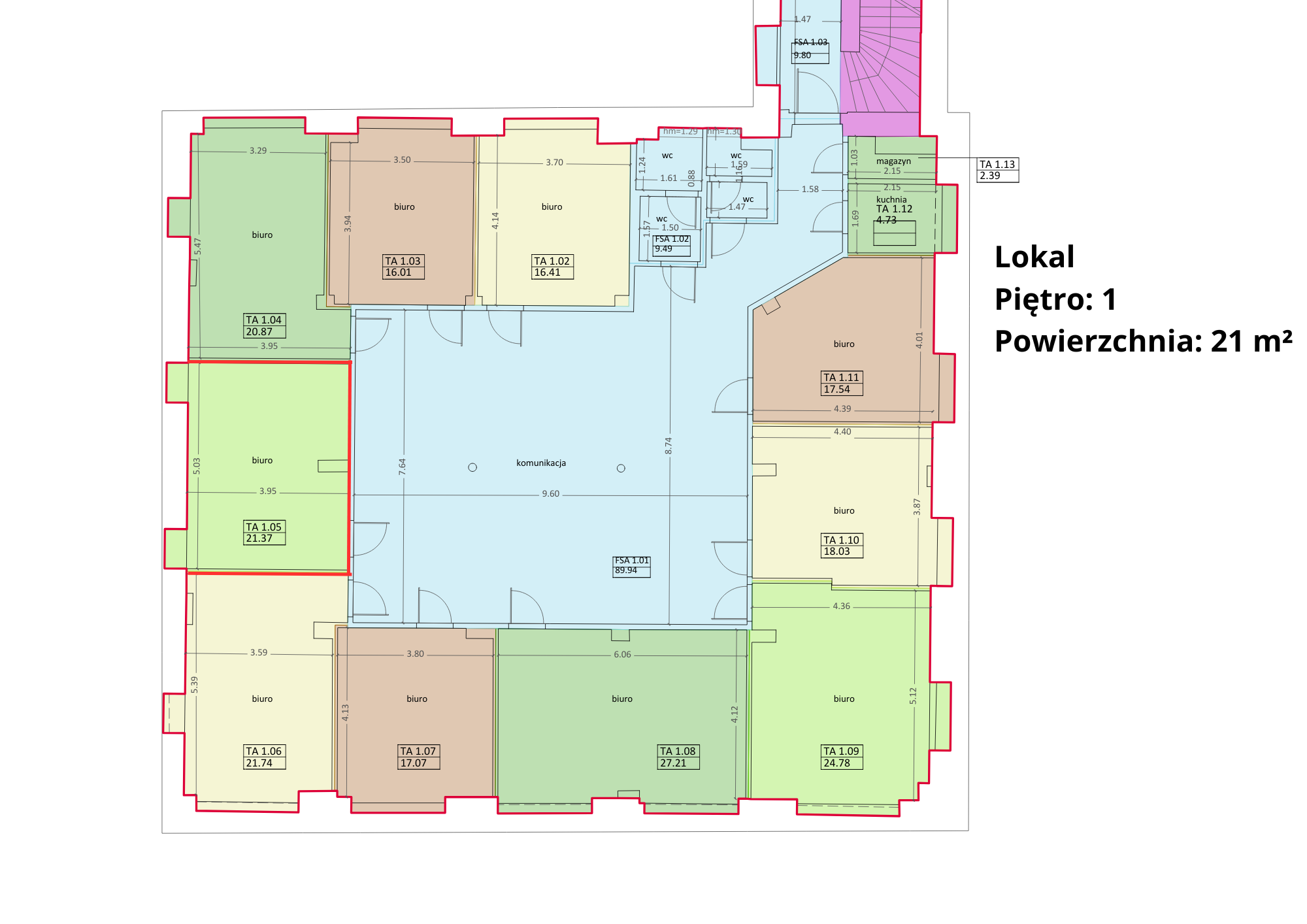 Lokal składa się z jednego, ustawnego pomieszczenia, które można zaaranżować jako gabinet, biuro indywidualne lub mały open space. Jasne wnętrze zapewnia komfortowe warunki pracy i naturalne doświetlenie przez większość dnia.