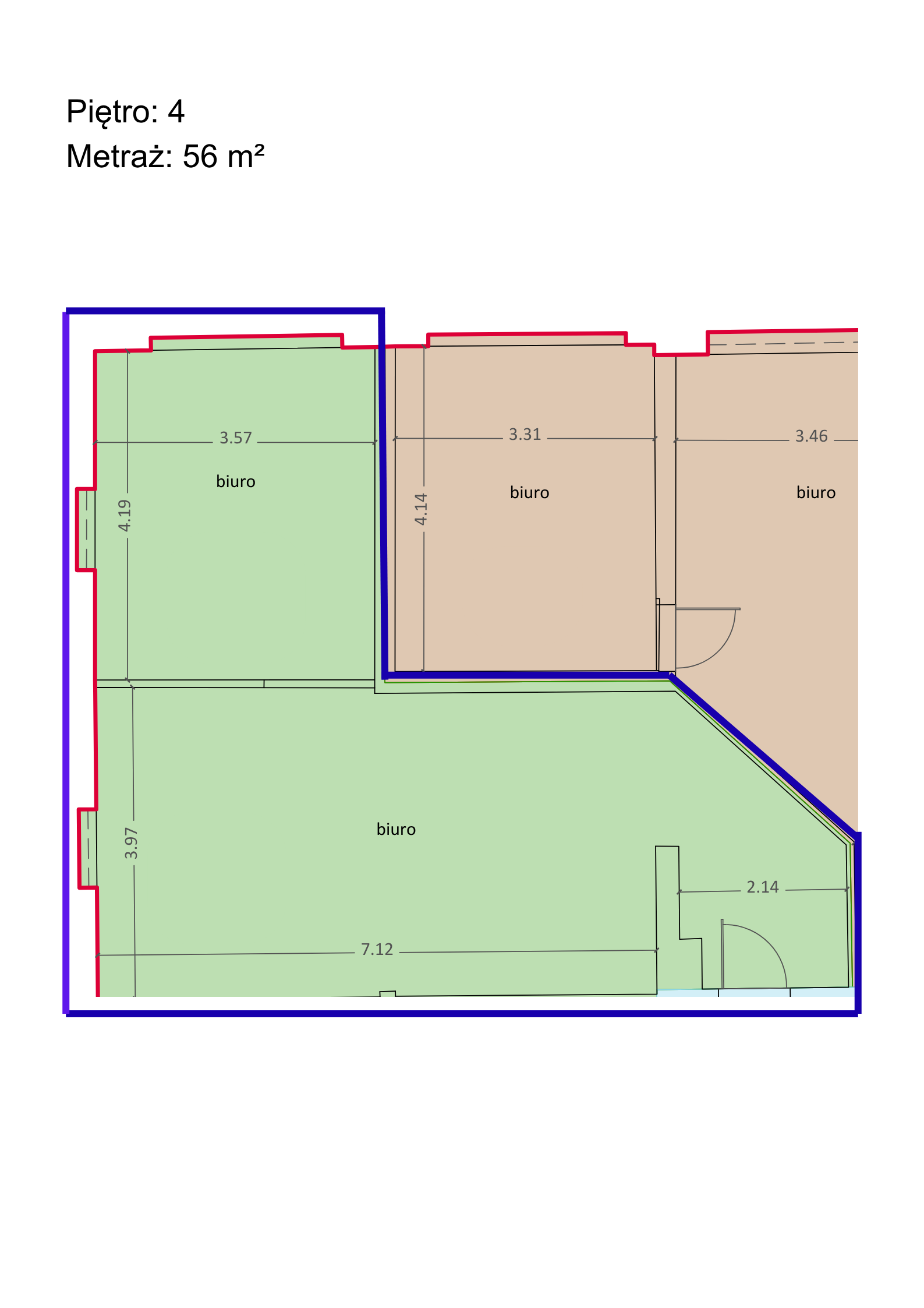 • Powierzchnia biurowa: 56 m² (2 pomieszczenia)