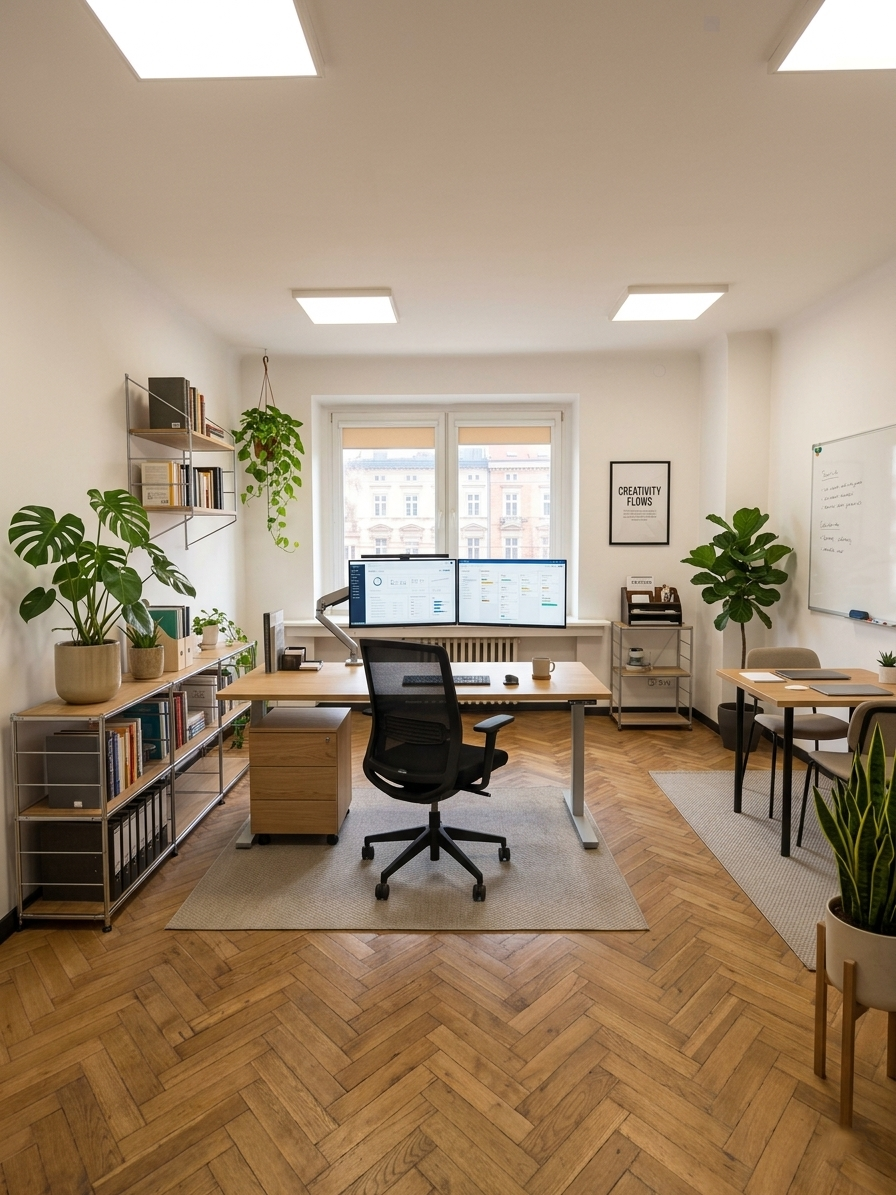 Lokal znajduje się na 1. piętrze budynku i stanowi praktyczną przestrzeń do pracy biurowej lub usługowej. Układ pomieszczenia pozwala na swobodną aranżację stanowisk pracy lub stworzenie niewielkiego gabinetu.