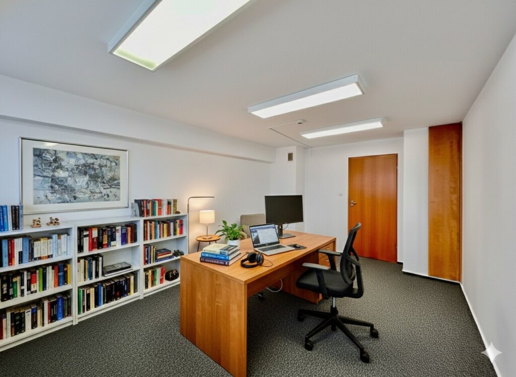 • Doświetlenie: Duże okna zapewniają naturalne światło i przyjazną atmosferę pracy.